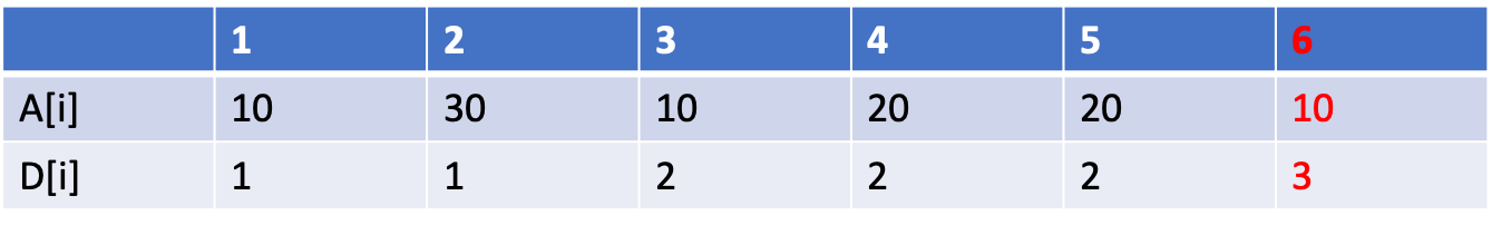 마지막으로 A[6]의 값이 가장 작고, 이전 값인 A[5]의 값은 A[6]보다 크다. 이때 D[5]의 값에 +1을 해준다.