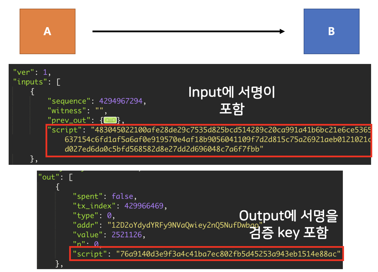 Bitcoin에서 트랜잭션은 Output spends(보냄)과 새로운 output 생성(보낼 것)이다. 그런데 비트코인의 각 트랜잭션마다 올바른 트랜잭션이라는 것을 검증한 전자서명(Digital Signature)이 포함되어있는데,